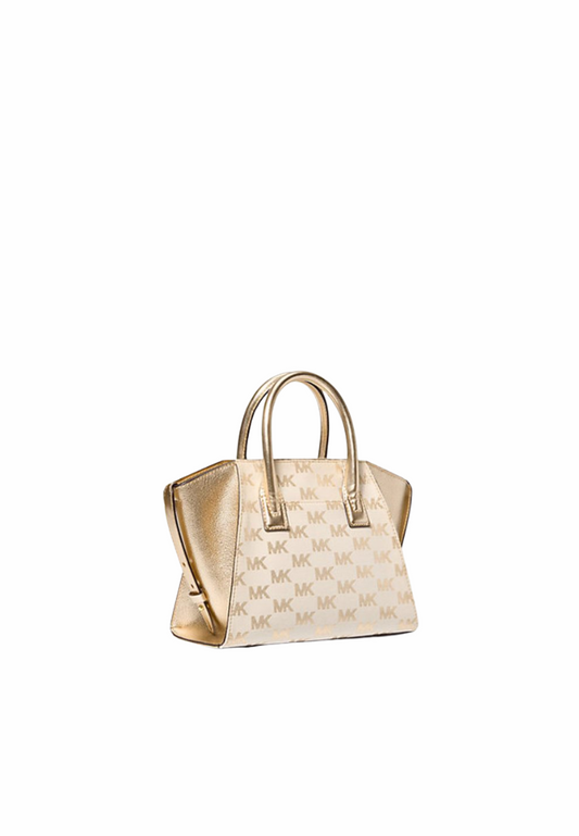 Michael Kors Avril Small Logo Jacquard and Metallic Satchel Bag In Pale Gold 35S5G4VS1U