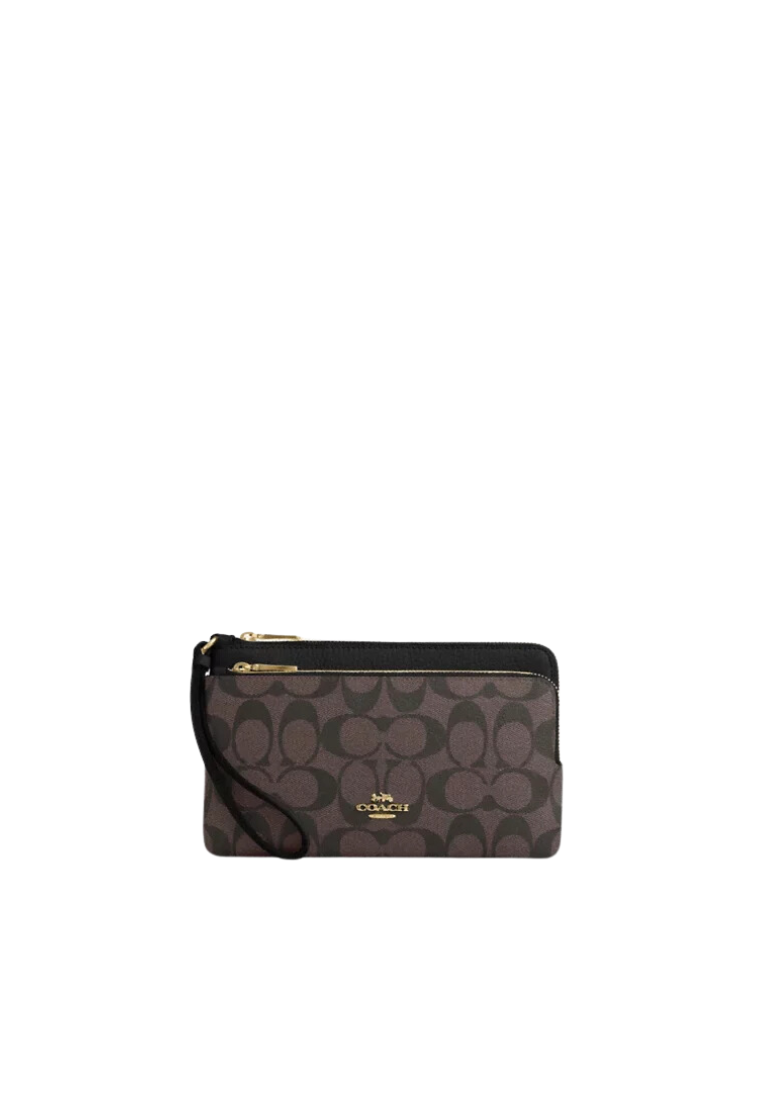 Coach Double Zip Wallet In Signature Canvas In Brown Black CU920