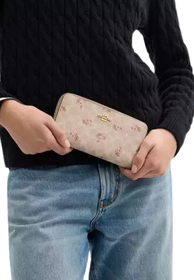 Coach Long Zip Around Wallet Signature Canvas With Floral Print In Sand Multi Car06
