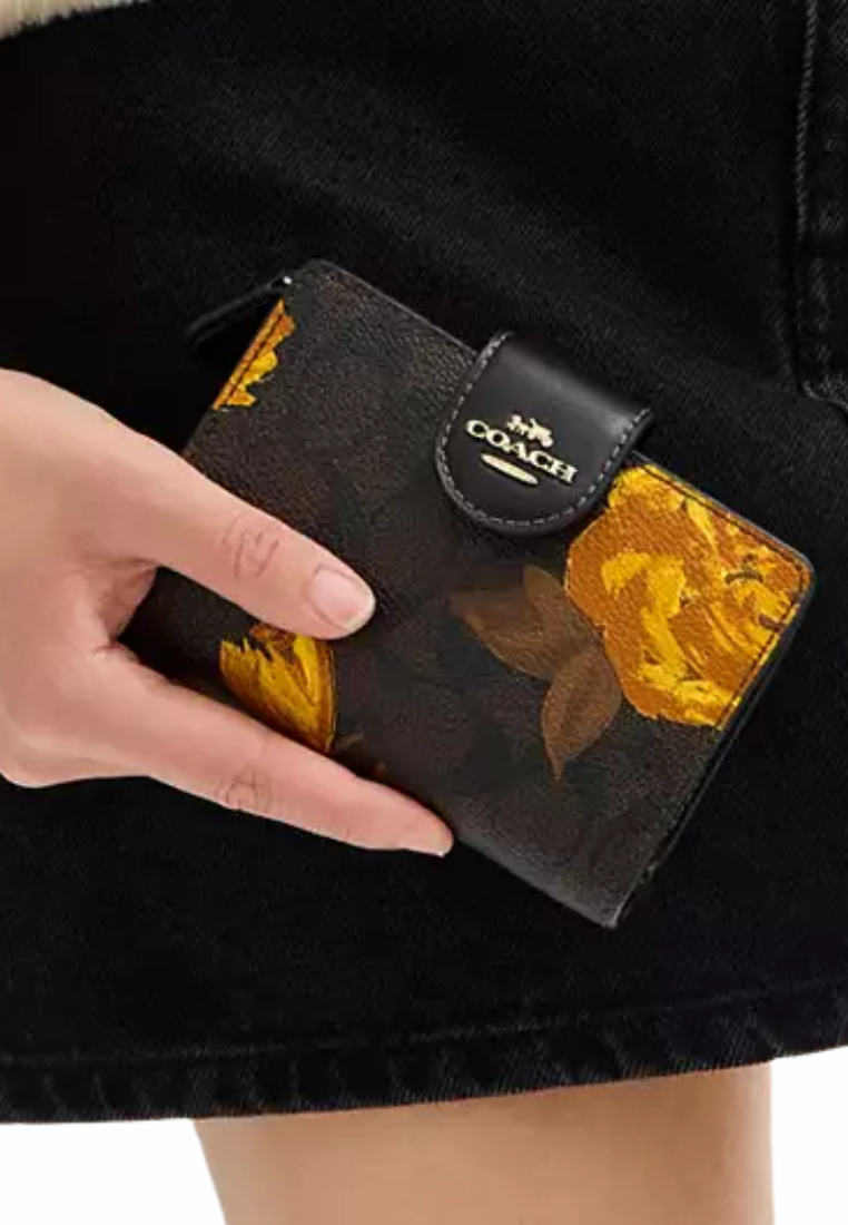 Coach Medium Corner Zip Wallet Signature Floral Print In Walnut Black Multi CCL69