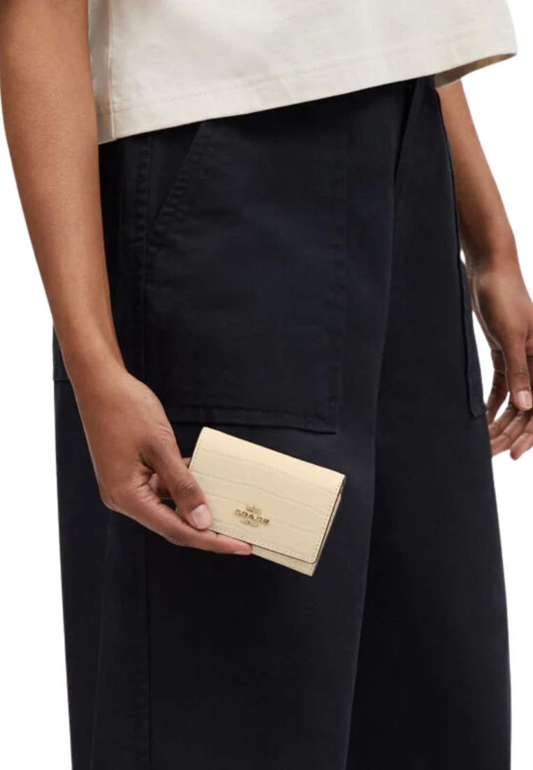 Zip coin pocket, Three credit card slots, Snap closure, Full-length bill compartment