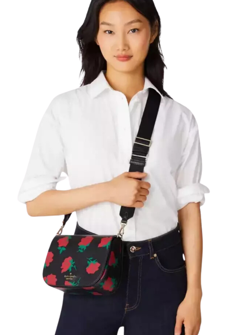 Kate Spade Madison Saddle Bag Rose Toss Printed In Black Multi KE533